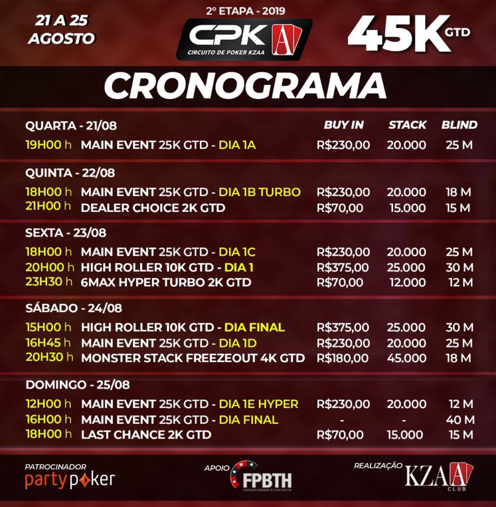 A partir desta quarta-feira (21), o principal clube de Campina Grande, na Paraíba, abre as portas para um grande evento. O Circuito de Poker Kzaa terá cinco dias de duração com uma grade repleta de opções e R$ 45.000 garantidos no total. O primeiro dia do evento já começa com as emoções do Dia 1A do Main Event.
