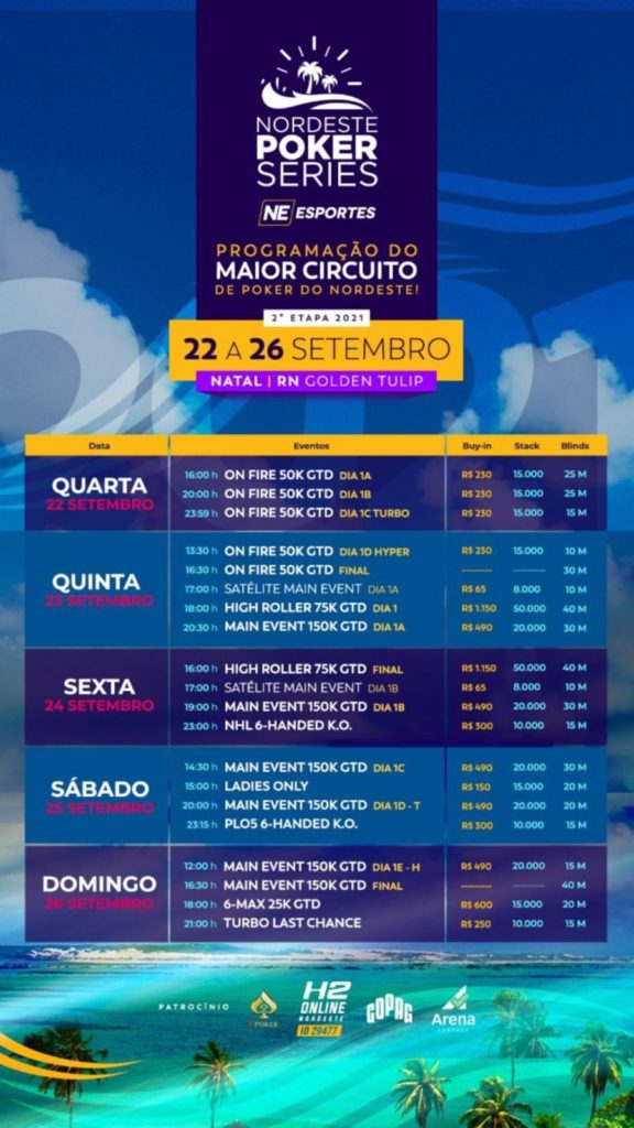 A grade de Natal mantém o mesmo padrão que deu muito certo em Fortaleza. Com R$ 300.000 garantidos na etapa, metade desse valor prometido está no Main Event, com buy-in de R$ 490 e sempre um custo-benefício dos bons. Outro carro-chefe é o High Roller com entrada de R$ 1.150 e um garantido de R$ 75.000.