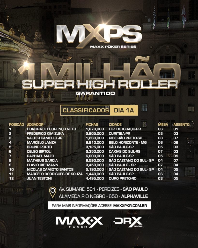 A quinta-feira (19) também foi importante com o início da disputa do Super High Roller. Com buy-in de R$ 3.500, o Dia 1A contabilizou 47 entradas e teve o jogador Matheus Garcia como chip leader com 9.590.000 fichas. Nomes como Marcelo Lanza (6.910.000), Alex Testoni (4.495.000), Bruno Porto (3.125.000), Celos Sirtoli (2.350.000) e Marcelo Rodrigues (1.440.00) são alguns dos 14 classificados.