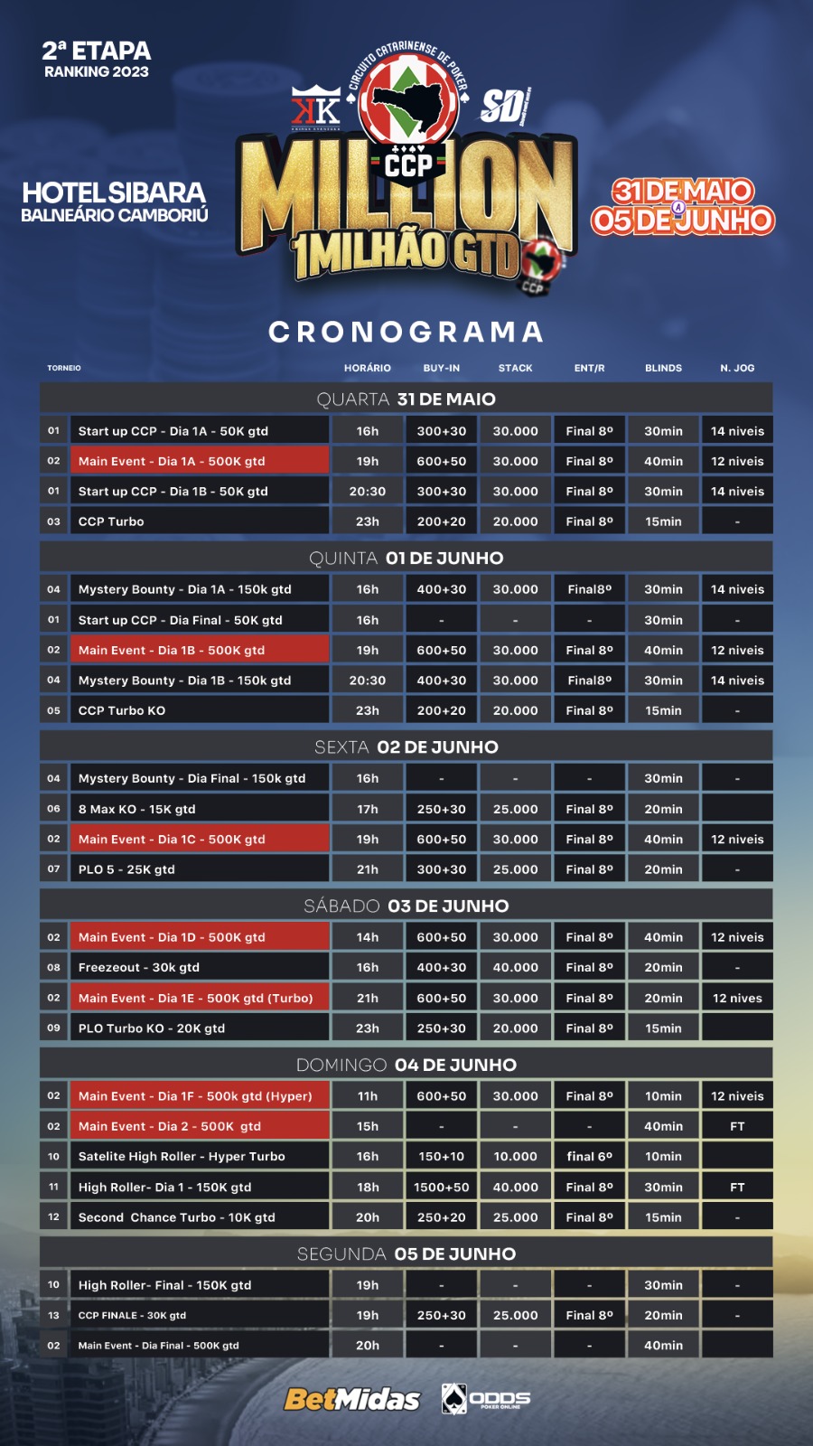 Os amantes do Circuito Catarinense de Poker (CCP) tem muito a comemorar neste ano de 2023. Como anunciado por Moisés Moraes, CEO da Kings Eventos, serão cinco etapas no ano e mais de R$ 3 milhões em prêmios. E, para continuar esse show, a segunda delas, o CCP Million, já vem com o garantido turbinado de R$ 1.000.000.