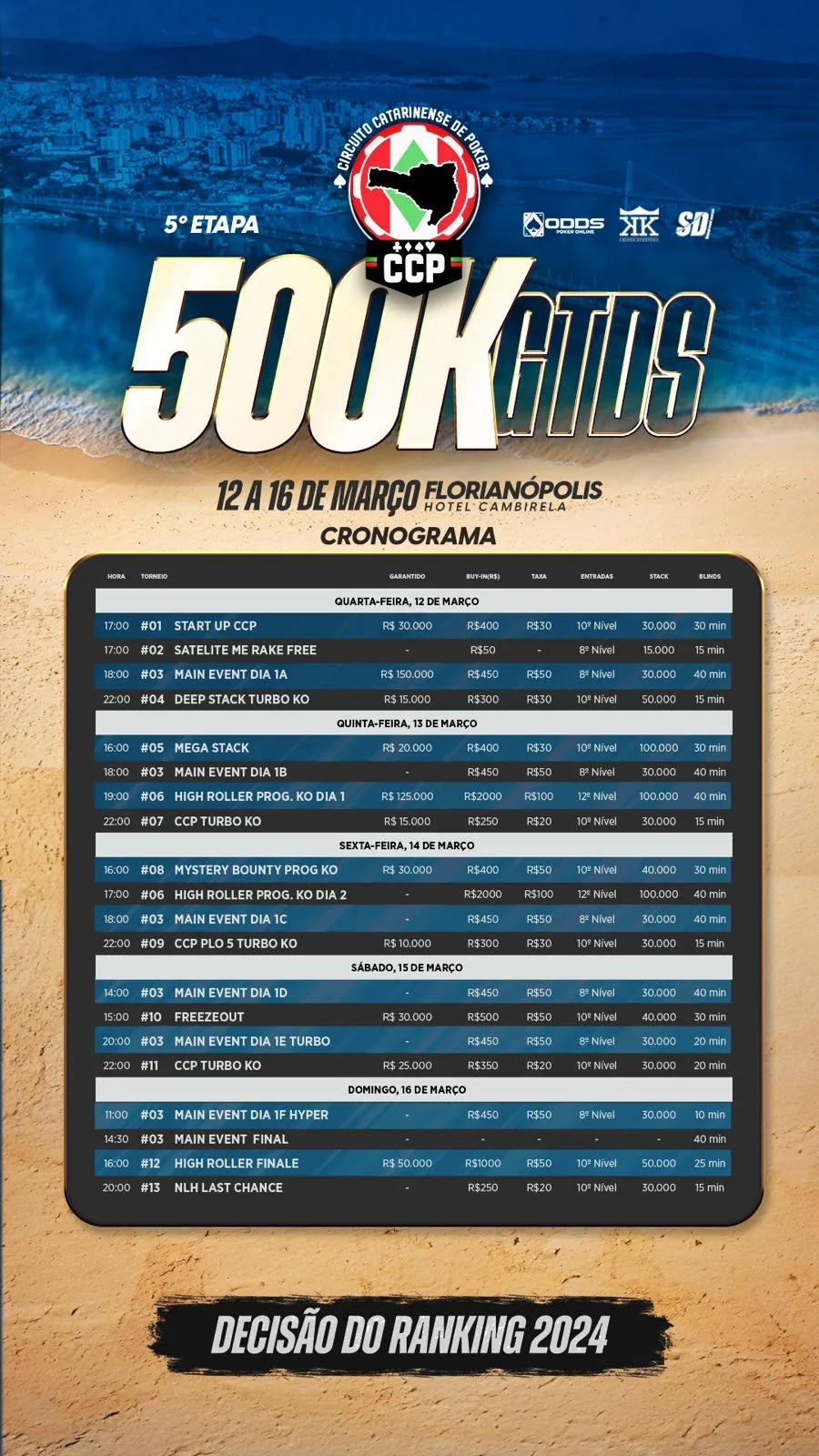 Entre os dias 12 e 16 de março, o Hotel Cambirela será palco do maior circuito de poker do estado de Santa Catarina e a grade de torneios está recheada. A série terá atrações para todos os gostos de tipos de buy-in, trazendo torneios com estrutura regular e turbo, de No-Limit Hold’em e de Pot-Limit Omaha.