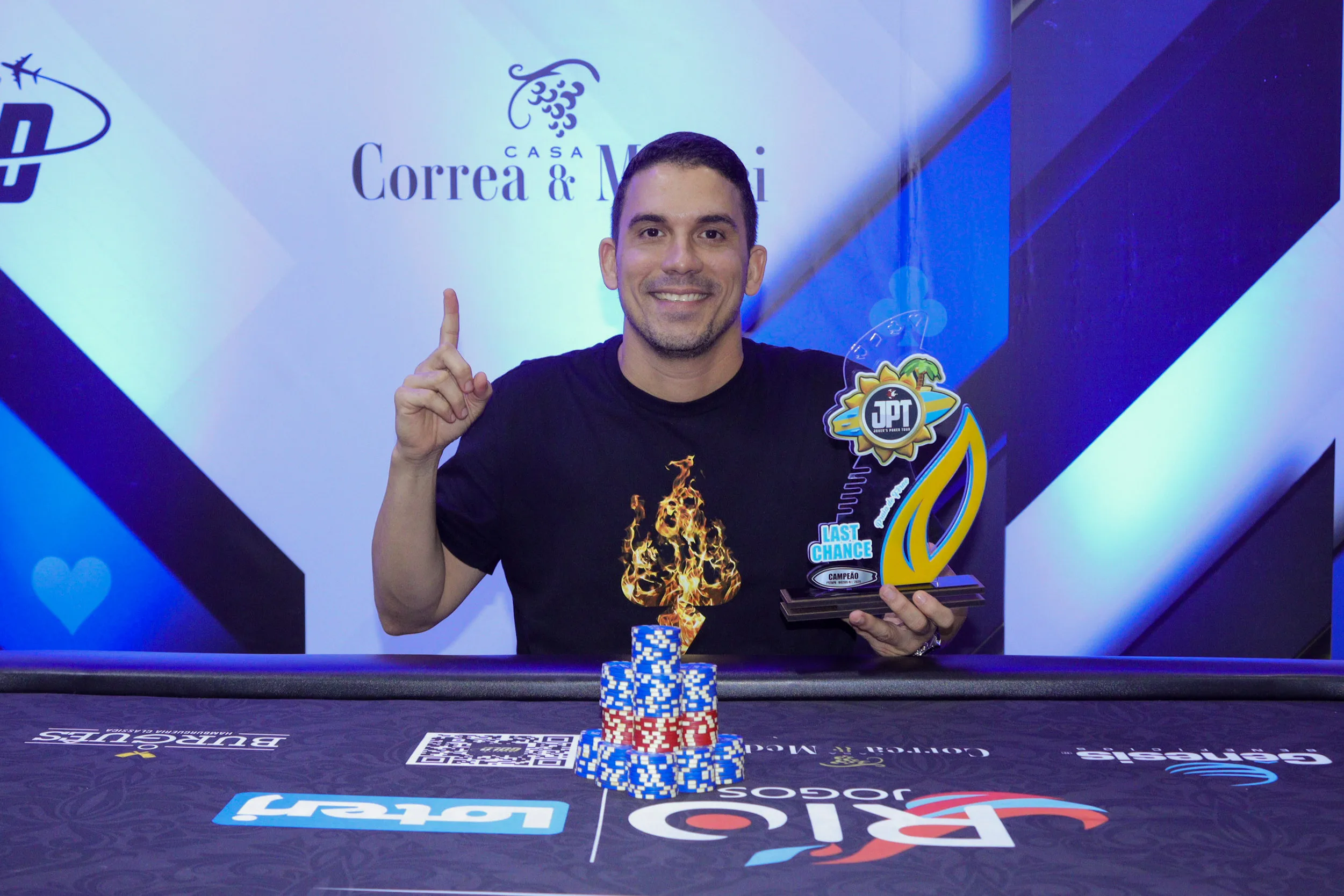 Quarto colocado no High Roller One Day que aconteceu no sábado, o jogador regular do JPT tinha acabado com aquele gostinho amargo de ter bolhado o troféu. Hoje, porém, ele conseguiu dar a volta por cima e não só garantiu o troféu, como foi logo o do primeiro lugar. O título no field de 46 entradas rendeu ao jogador o prêmio de R$ 2.300. O buy-in foi de R$ 250.
