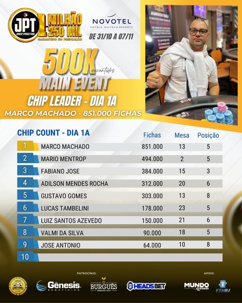 No Dia 1A, foram registradas 95 entradas e o dia foi finalizado com nove nomes classificados. A liderança disparada ficou com Marco Machado, dono de um stack gigante de 851.000 fichas. Mário Mentrop e Fabiano José aparecem em segundo e terceiro, com 494.000 e 384.000, respectivamente.