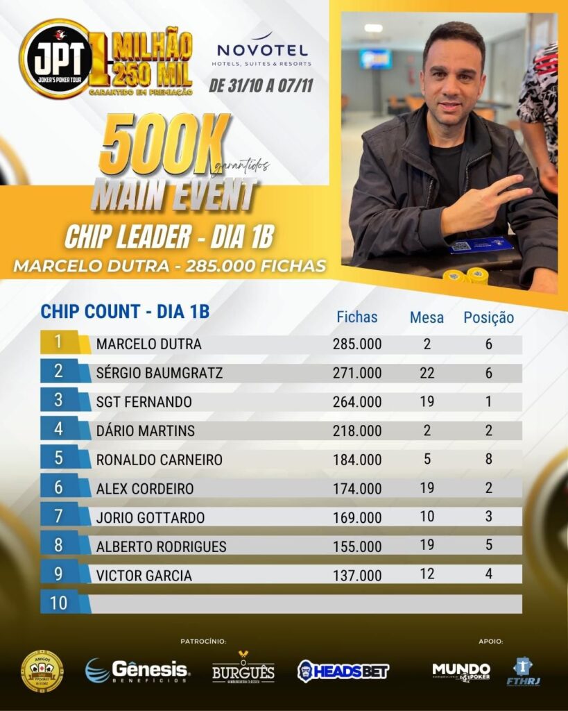 Já no Dia 1B, a ponta da tabela ficou com o regular Marcelo Dutra. Campeão do High Roller da última etapa, o carioca já está garantido na sequência da competição. Ele avançou com 285.000 fichas. Sérgio Baumgratz é o segundo, bem perto, com 271.000 fichas, e SGT Fernando é o terceiro, com 264.000.