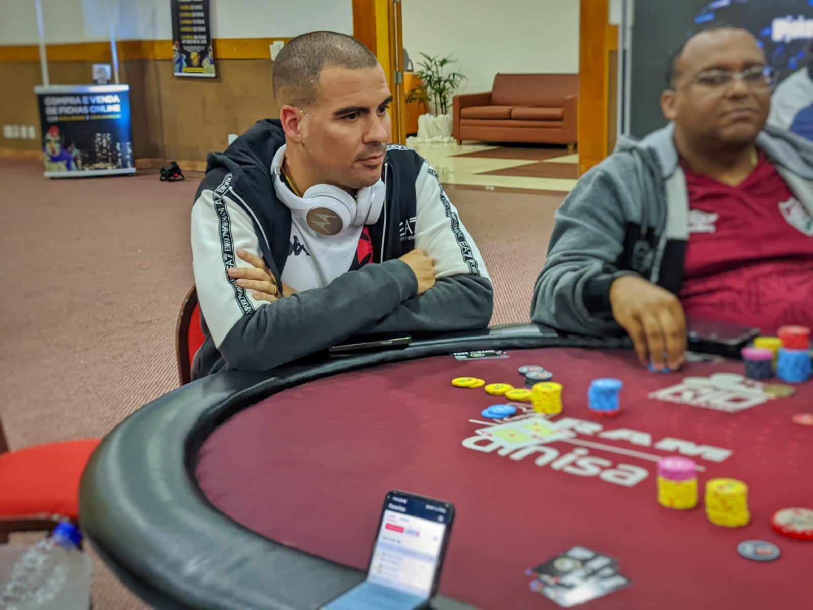 “O jogador que estava no heads-up tinha muita ficha desde o início. Eu também cheguei a ficar bem de stack, mas ele assumiu a liderança novamente e fez muitas fichas logo no começo. Então ficou muito grande e passou a pressionar bastante a mesa. Tinha três jogadores muito curtos, que estavam segurando bastante o jogo. Eu tive que esperar um pouco. O bom é que ele estava à minha direita, então esperei os momentos certos. Nos poucos folds dele, eu aproveitava para jogar e pelo menos me manter com um stack saudável, pensando em chegar competitivo no heads-up, sem ficar curto. Consegui puxar um pote importante, acho que até fora de posição, em um blefe contra ele, que acabou passando. Isso me deixou bem de ficha, e a gente chegou ao heads-up praticamente empatado”, contou.