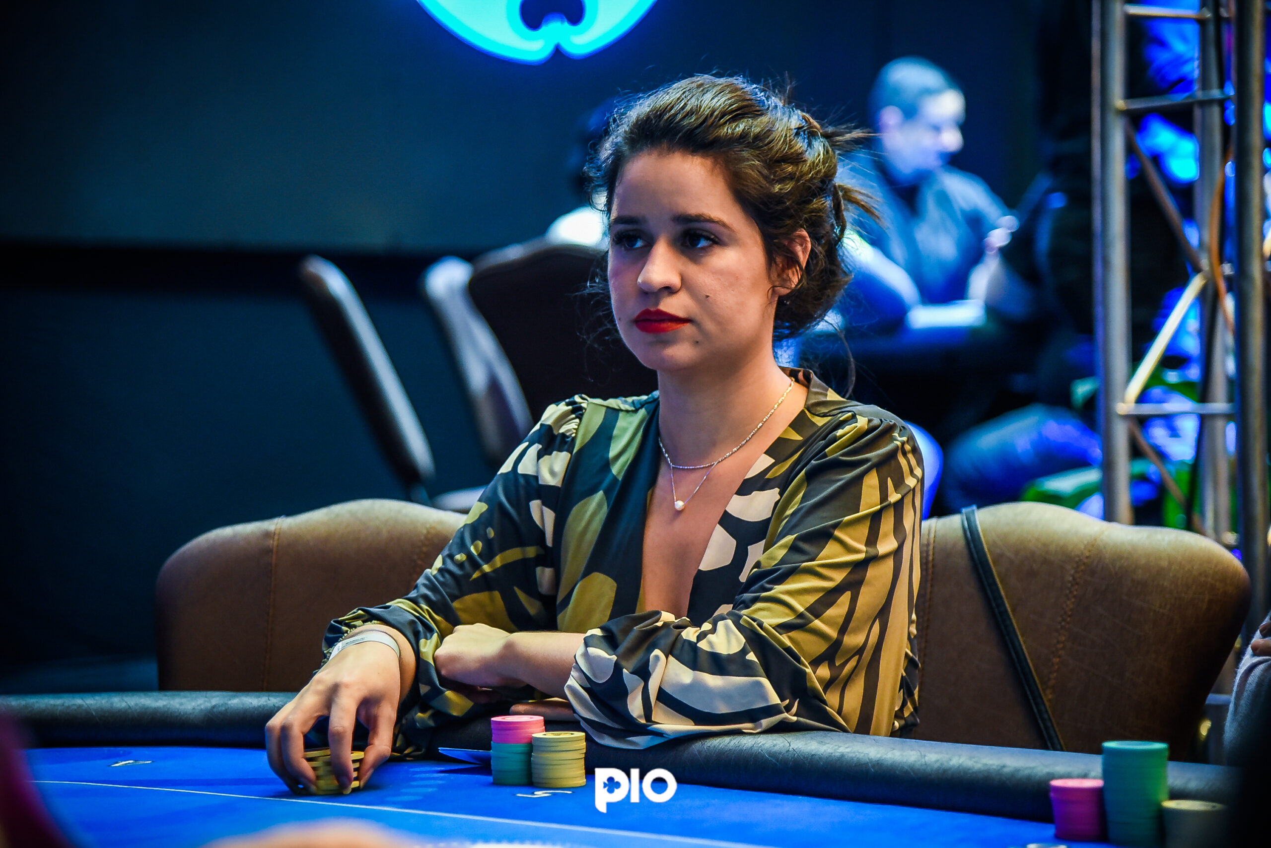 Nos blinds 800 / 1.600, ele deu raise para 3.500 fichas e ela pagou com AJ no botão. No flop 223, o vilão c-betou 3.500 fichas e ela pagou a primeira. A ação se repetiu no turn T, mas agora a aposta foi de 10.000. “Eu acho que ele ainda vai continuar com muita coisa e dependia do que ia virar no turn. No meu pensamento, se batesse K ou Q seriam as que me fariam foldar no river”.