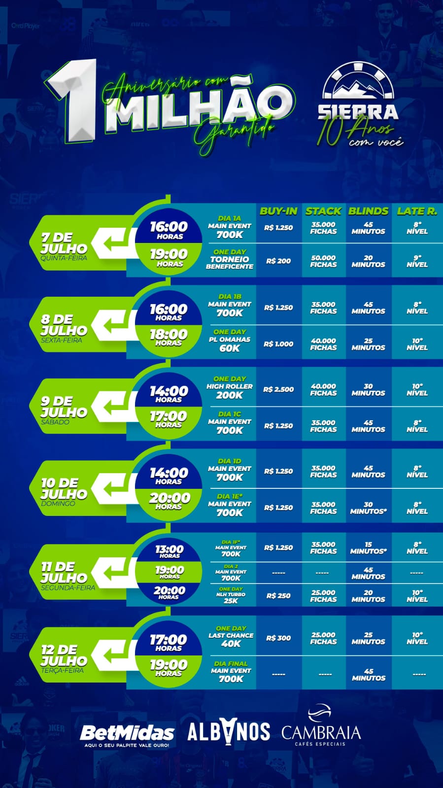 Na terça-feira, (12/07) acontece o Dia Final às 19:00. Vale lembrar sobre a transmissão ao vivo com cartas reveladas de todos os torneios da grade, no canal do Youtube, SierraPokerTV. A segunda maior atração do evento é o High Roller, marcado para o dia (09/07) às 14:00h, contará com um garantido de R$ 200.000 e um buy-in de R$ 2.500.