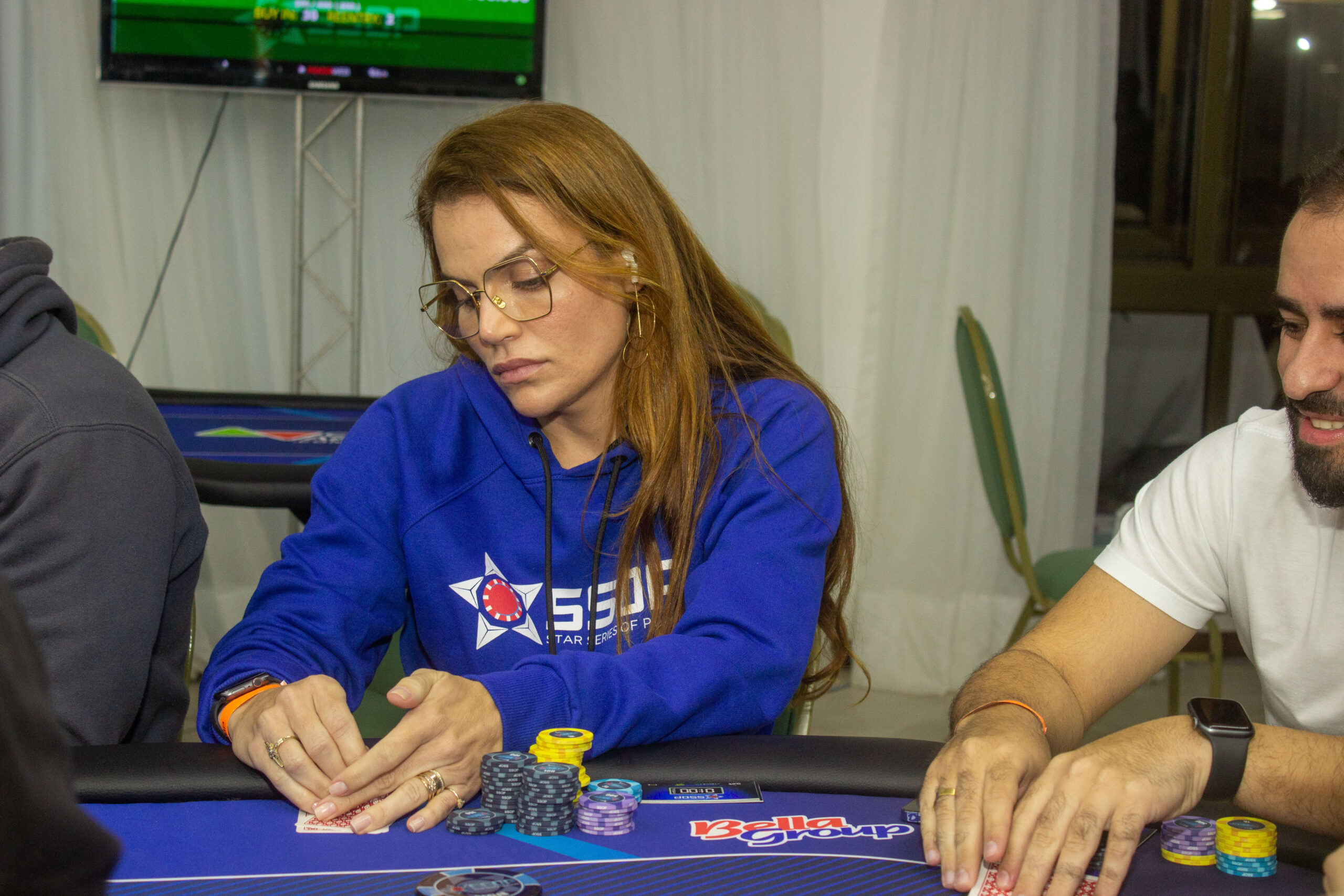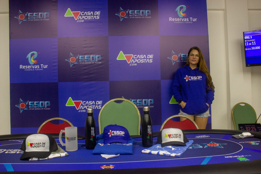 As mesas do SSOP têm recebido algumas jogadoras durante os primeiros dias e uma das que está marcando presença desde o começo é Janina Andrade. Dona de uma clínica de estética avançada, ela é esposa de Beto Cavadas, sócio do evento, e foi exatamente através dele que ela entrou pro mundo do poker. Ali, depois de entender o funcionamento e todos os benefícios que o esporte traz, foi paixão na certa.
