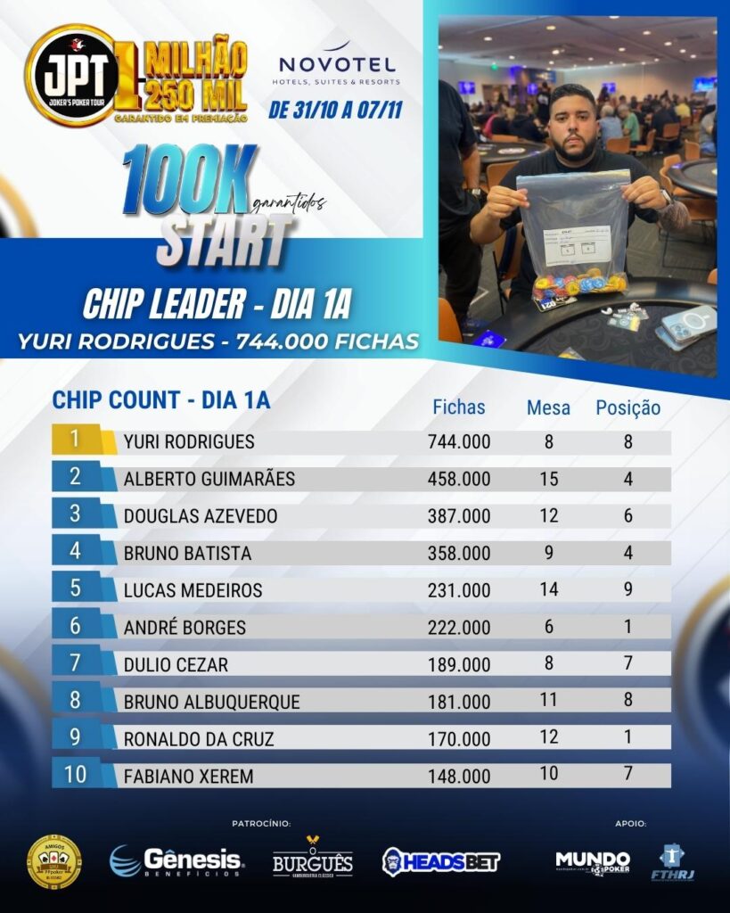 Yuri Rodrigues e Almir Reis lideram os Dias 1A e 1B do Start 100K do JPT no Rio de Janeiro; confira os chip counts