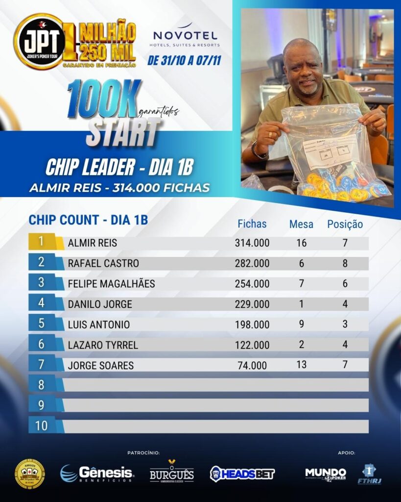 O Dia 1B contabilizou 59 entradas e sete jogadores carimbaram a passagem. Almir Reis avançou na liderança com um montante de 314.000 fichas. Rafael Castro, Felipe Magalhães, Luís Antonio, Lazaro Tyrrel e Jorge Soares também se garantiram no Dia 2. Restam dois classificatórios para o encontro dos classificados.