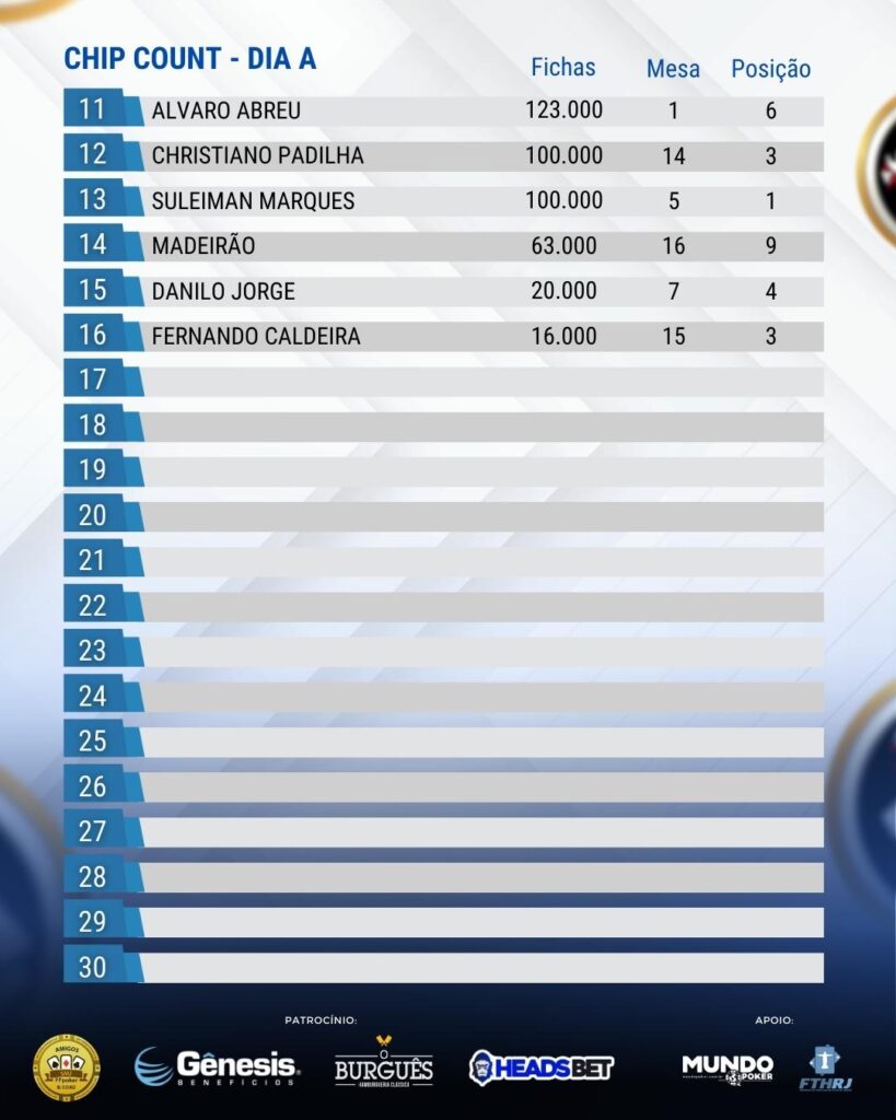 O Dia 1A foi um sucesso com 143 ativações e 16 jogadores classificados. Quem puxou a fila foi Yuri Rodrigues com um stack imponente de 746.000 fichas. Alberto Guimarães veio atrás com 458.000 e Douglas Azevedo fechou o top 3 com 387.000. Lucas Medeiros, Bruno Albuquerque, Fabiano Xerém, Madeirão e Fernando Caldeira foram alguns dos classificados.