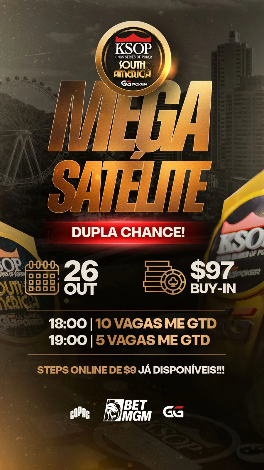Un Mega Satélite para el Main Event del KSOP GGPoker South America marcará el domingo (26) en GGPoker. En total, se distribuirán 15 plazas para el mayor torneo de la serie, que tiene un buy-in de R$ 5.000 y un garantizado de R$ 6 millones, y promete ser el mayor torneo de toda la etapa.