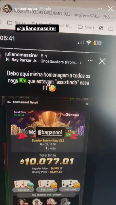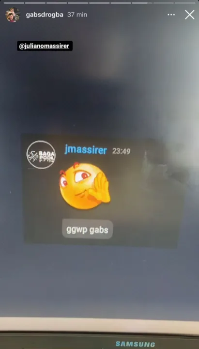 E aí vem o fato que desencadeou a reação do “GabsDrogba”. Quando o amigo caiu, outro dos jogadores da mesa, o regular Juliano Massirer, escreveu no chat a seguinte mensagem: “ggwp gabs”, fazendo a insinuação de quem estava jogando era Gabriel Schroeder. E essa acusação causou forte indignação no profissional, a ponto de fazer os stories no Instagram para falar sobre o assunto.