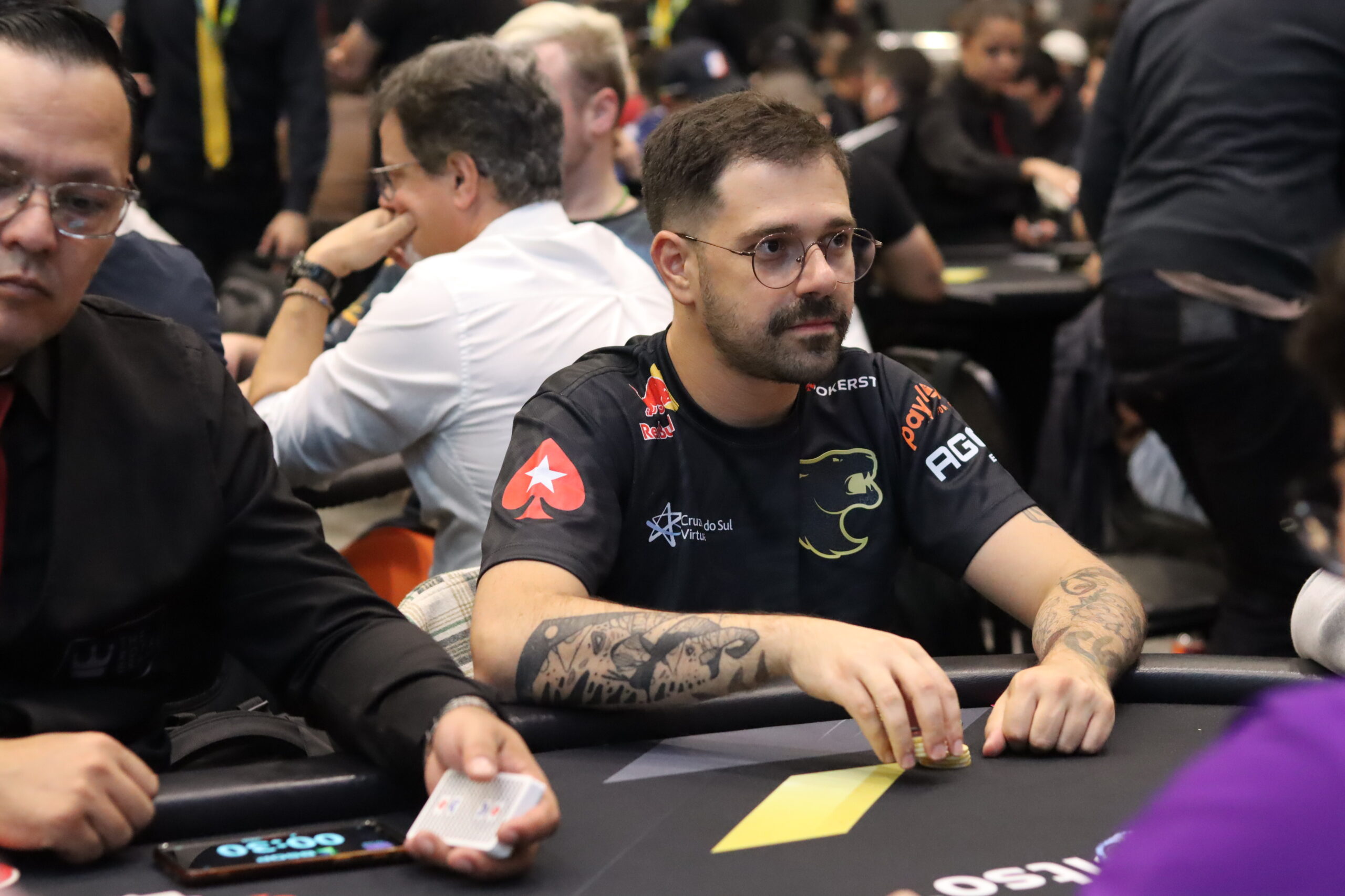 Com stack disparado novamente, ele pressionou os adversários sem piedade e contou com o baralho para coletar eliminações. Ele quebrou um QQ com KQ e depois tirou um rival do jogo de J6 contra 88. O heads-up contra Savino começou com boa vantagem para Felipe, mas o mineiro endureceu a disputa e conseguiu bons potes.