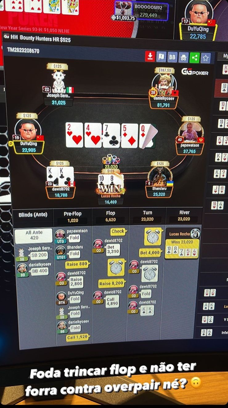 A mão ocorreu no Bounty Hunters HR US$ 525 e foi divulgada pelo próprio “Rochinha” no Instagram. Nos blinds 200 / 400, ele abriu raise do hijack para 880 fichas com e tomou 3-bet do peruano “danielkyosev” para 2.800 no botão. Os blinds foldaram e Lucas pagou sem posição, porém, com um cenário bastante deepstack para ambos jogadores.