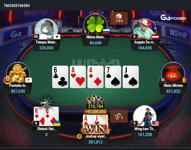 De AJ contra KQ, “John Milly” não sofreu no board A647J e conseguiu o objetivo de todos ao ver o baú dourado aparecer com a forra milionária. Ele ainda conseguiu manter o controle para jogar por horas e cair apenas na 224ª colocação com um prêmio total de US$ 1.007.937. O grinder já disputou torneios caros e fez uma mesa final do cobiçado Super MILLION$ de US$ 10.300.