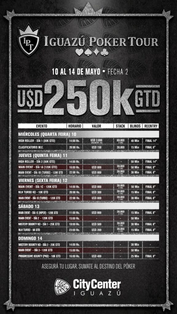 Está chegando a hora dos jogadores matarem a saudade do sempre charmoso Iguazú Poker Tour. A segunda etapa da temporada de 2023 vai acontecer entre os dias 10 a 14 de maio no City Center Iguazú, em Puerto Iguazú, na Argentina. As emoções de uma grade caprichada com US$ 250.000 garantidos já começam na quarta-feira (10).