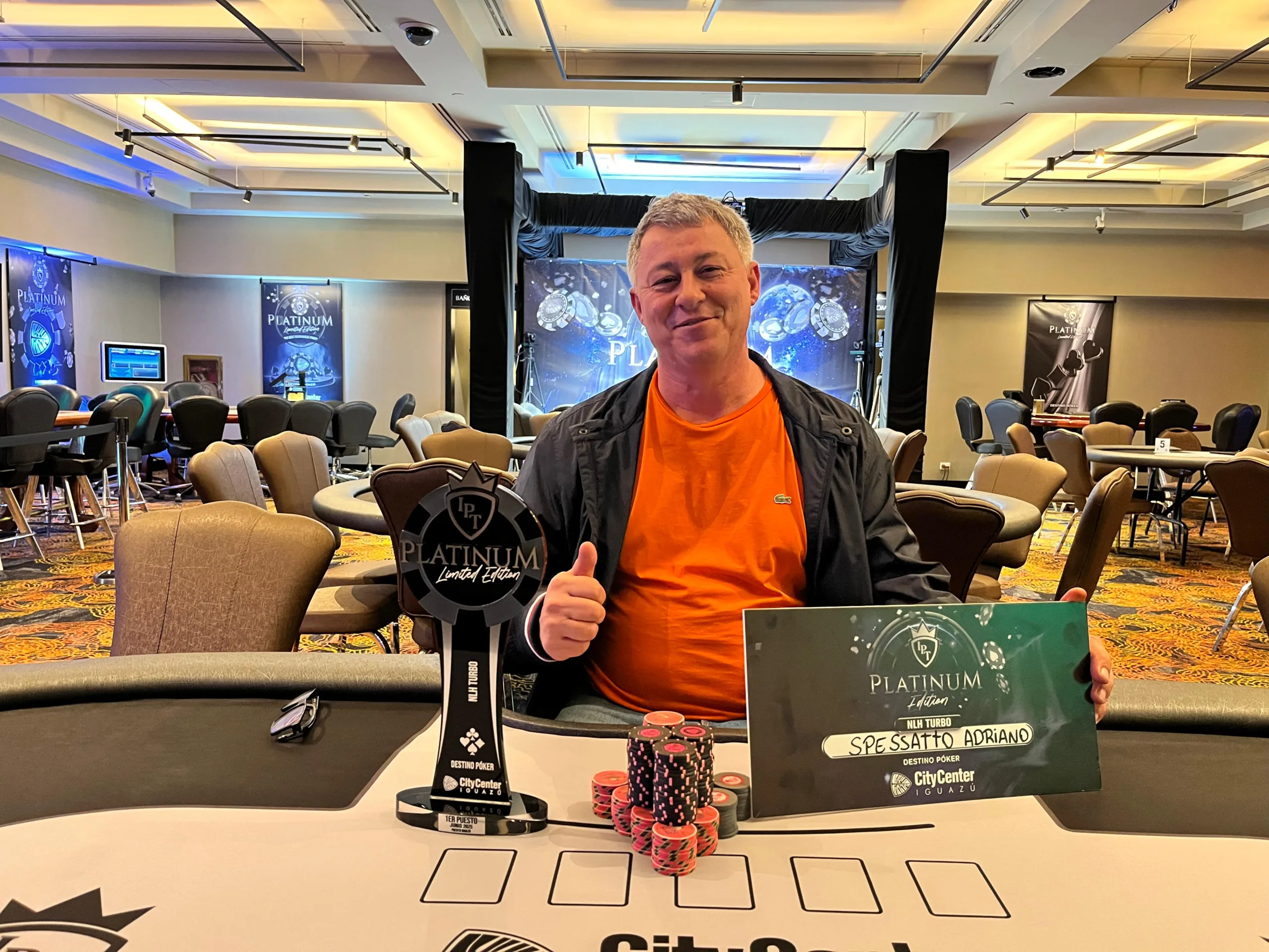 Frequentador das etapas do IPT, ele não obteve sucesso no evento mais caro da grade, mas levará um troféu para casa ao superar o field de 130 entradas na competição de buy-in US$ 500. Como recompensa pela cravada, Adriano Spessato saiu com US$ 2.630 nos bolsos.