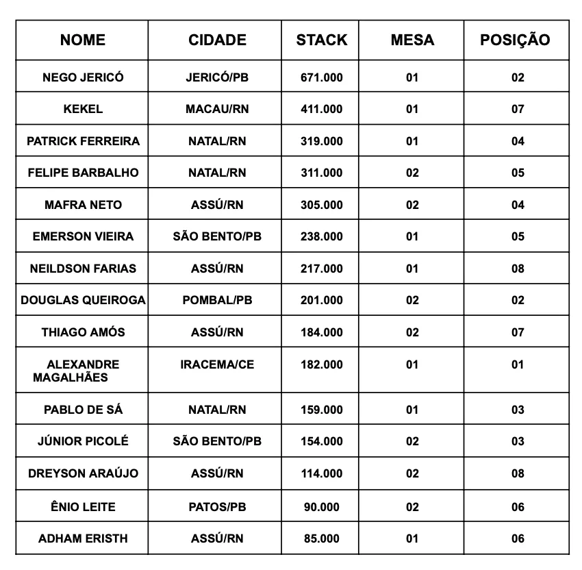 Ao término do dia, 15 jogadores ensacaram suas fichas. Claudivan, o “Nego Jericó”, somou o maior stack, com 671.000 fichas. Kekel (411.000) e Patrick Vieira (319.000) fecham o top 3.