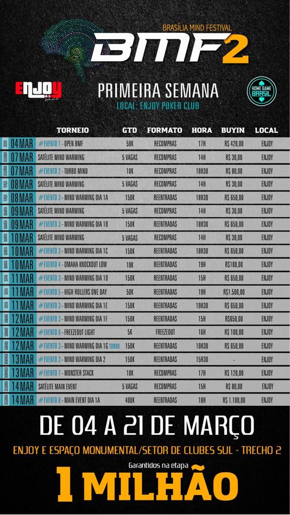 A maior série do centro-oeste já tem data marcada para os amantes do poker começarem a se programar. O Brasília Mind Festival, evento que fez enorme sucesso em sua estreia, chega no mês de março com um garantido turbinado para R$ 1.000.000. A grade de torneios atenderá todos os públicos com eventos distribuídos em duas semanas de muito poker.