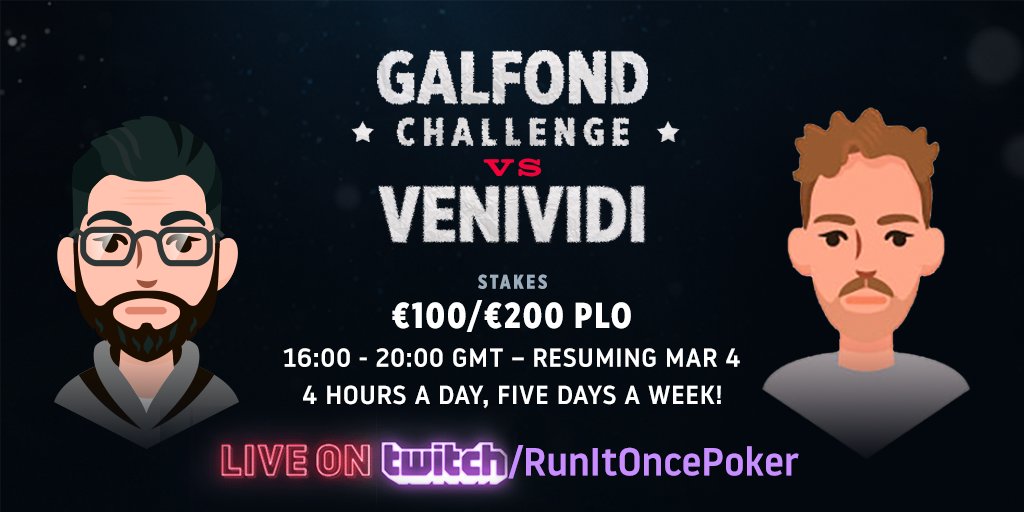 O objetivo do desafio € 100.000/€ 200.000 PLO é jogar 25.000, ou seja, ainda faltam 15.073 mãos para terminar a competição. Até agora Phil Galfond e “VeniVidi” completaram 60.29% do jogo.