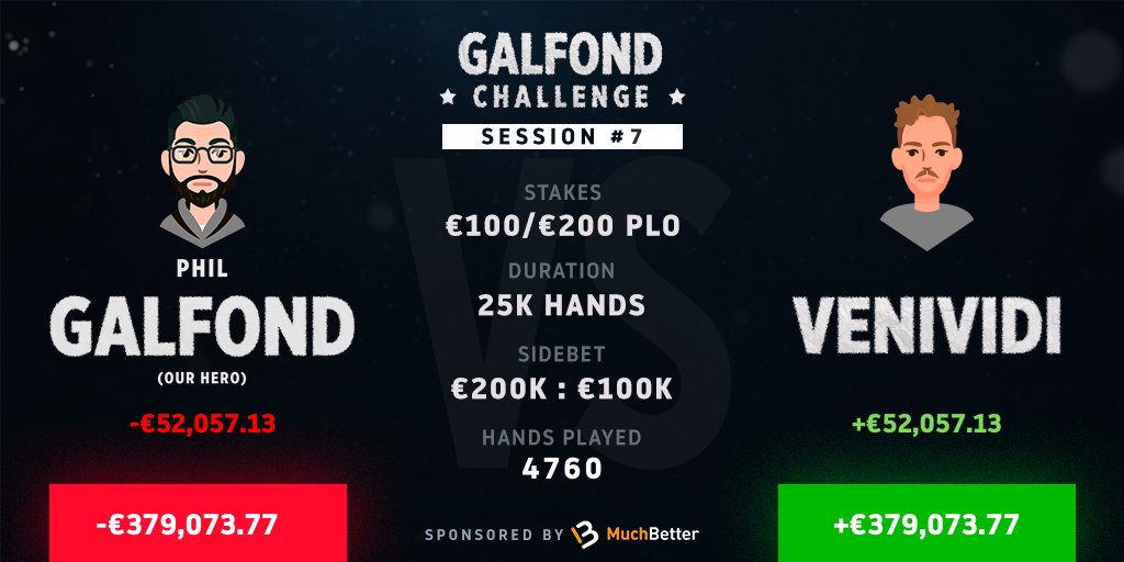 Até o momento já foram jogadas 4.760 mãos, do total de 25.000 mãos, do € 100/200 PLO, ou seja, apenas 19.04% do jogo foi concluído. Desses sete dias de disputa, Phil Galfond venceu apenas uma vez e ainda foi um ganho pequeno se comparado aos do adversário.