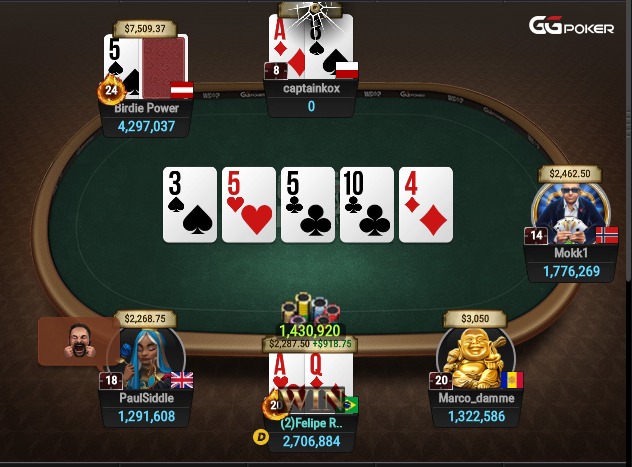 Com aproximadamente 15 left, Mojave mirou o bountie do polonês “captainkox” e deu all in no meio da mesa com após o adversário colocar todos os 5bb que tinha do UTG com . O board correu tranquilo para o brasileiro com , garantindo assim uma premiação extra para Mojave que já soma US$ 3.206 em bounties.