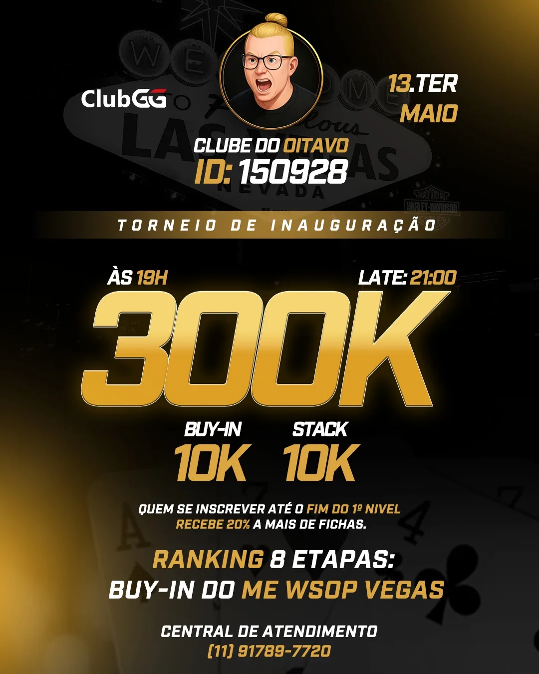 E tem mais: chegando com força total no mercado, o Clube do Oitavo vai contar com um ranking especial nessa abertura. Com oito etapas programadas, o melhor jogador vai levar um buy-in para o Main Event da WSOP em Las Vegas, no valor de US$ 10.000. Dá pra perder uma chance dessas?