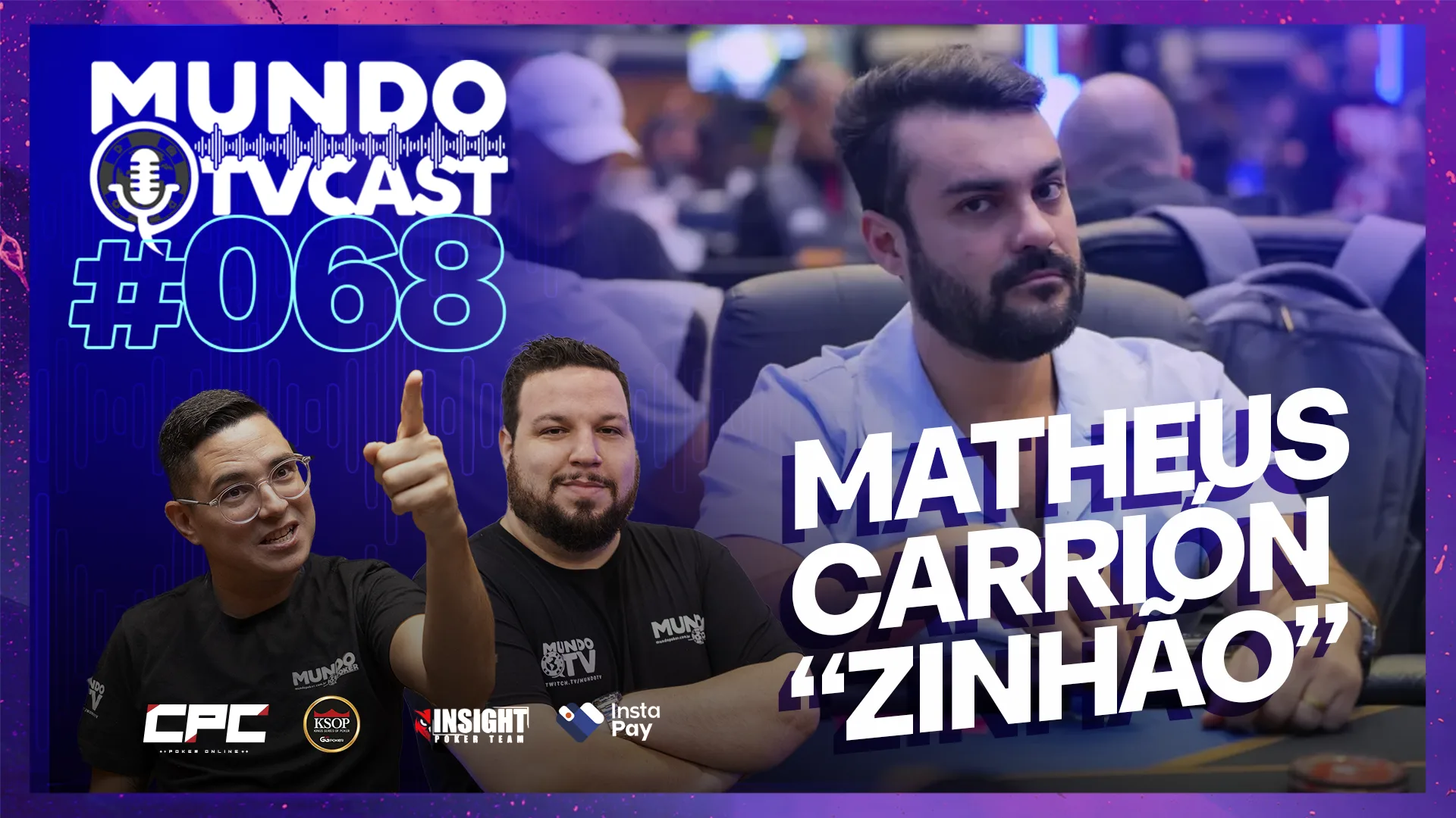 Um dos jogadores com mais personalidade do poker brasileiro, Mateus Carrión, o Zinhão, foi o terceiro convidado da nova fase do MundoTV Cast, agora sob o comando de Ytarõ Segabinazzi e Rennan Castro. Como de costume, sem papas na língua, o gaúcho falou sobre diversos assuntos que estão quentes no momento.