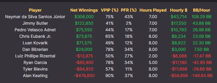 Ele, Jimmy Buttler, Pedro Velasco, Eubank, Jon Vlogs, Dan Bilzerian, Luiz Rizental “BRAZIL GOD”, Ryan Garcia, Ninja e Alan Keating arriscaram quantias altíssimas em um “home game” estrelado. Foi uma longa sessão com mãos interessantes e, no final, quem mais se deu bem foi justamente Neymar Jr.