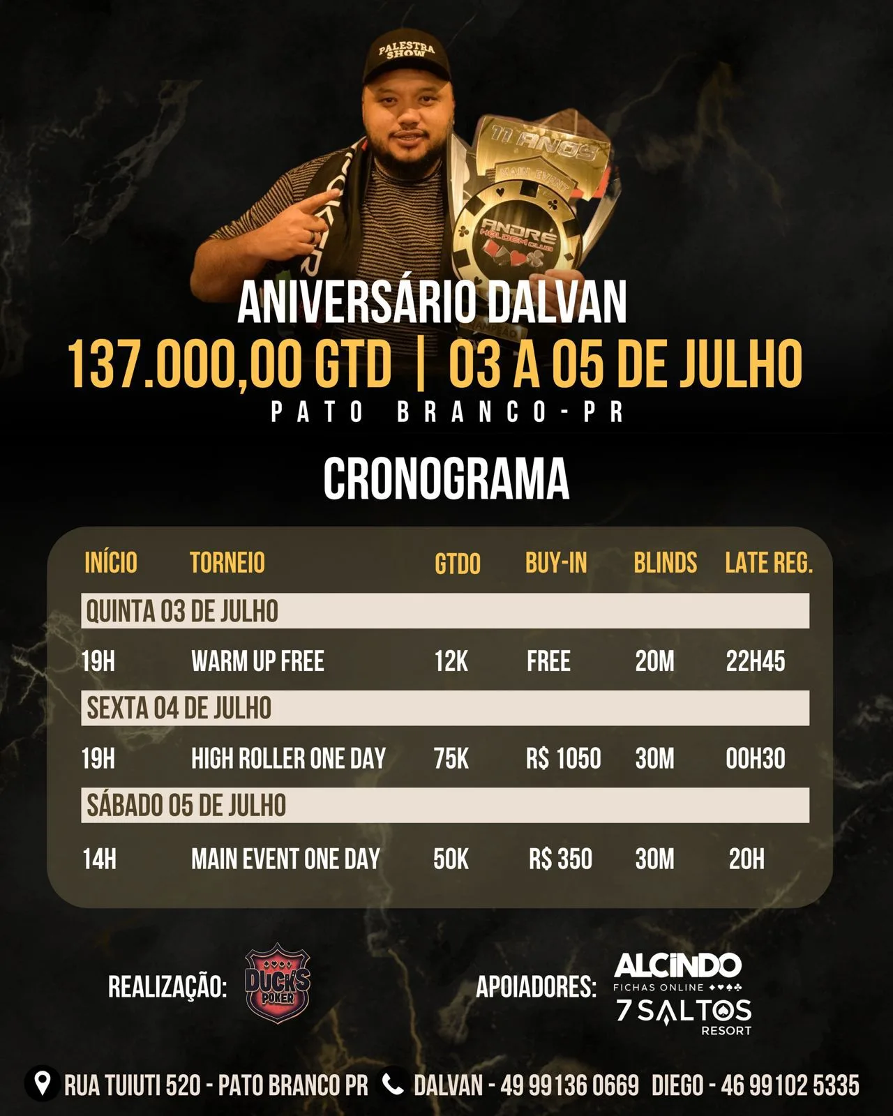 O evento comemorativo será feito em homenagem ao Aniversário do Dalvan, sendo esse mesmo o nome da programação. Entre os dias 03 e 05 deste mês, o Ducks Poker Club vai organizar uma série com três torneios e distribuirá, pelo menos, R$ 137.000, valor garantido na premiação do Aniversário do Dalvan.