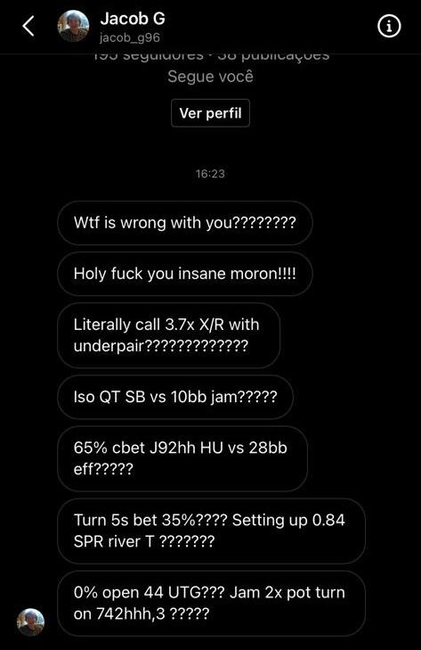 Sim, isso mesmo. Jacob G, agora o inimigo dos brasileiros, parece ter como hábito ir nas redes sociais dos jogadores destilar o ódio após perder mãos importantes. No caso de Semeghini, ele partiu mais para o xingamento direto. Com Brum, a história foi ainda mais longe. O gringo revoltado, além de ofender, deu uma palestrinha para o gaúcho.