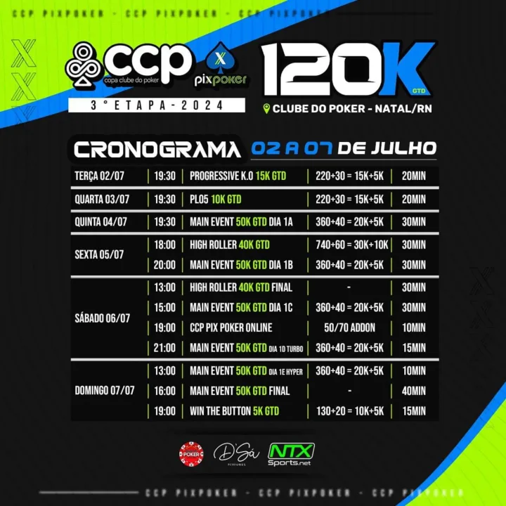 O evento vem com R$ 120.000 garantidos e o valor será espalhado nos cinco torneios que compõe a tradicional grade do circuito. Também tradicional é o local onde vai acontecer a terceira etapa do CCP PixPoker: o conhecido Clube do Poker, principal casa do poker na cidade de Natal.