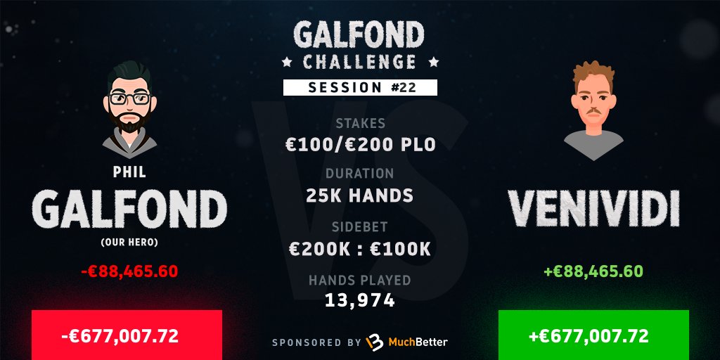 Os participantes jogaram 556 mãos, somando 13.974 do desafio € 100.000/200.000 PLO. Caso Galfond desista agora da competição ele terá de pagar € 877.007.72. Enquanto o adversário precisa pagar para o empresário somente € 577.007.72.