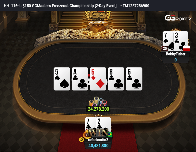 O polonês “BobbyFischer” não quis ir all in e decidiu brigar pelo título, afinal, é uma conquista de série. Mas, ao se envolverem em um grande pote onde o bordo mostrava 5A68, os dois foram all in. O brasileiro tinha 72 e o russo 73, com pedidas de sequência. No entanto, o river 6 completou o flush de paus para “rafaelomito2” que finalizou a disputa.