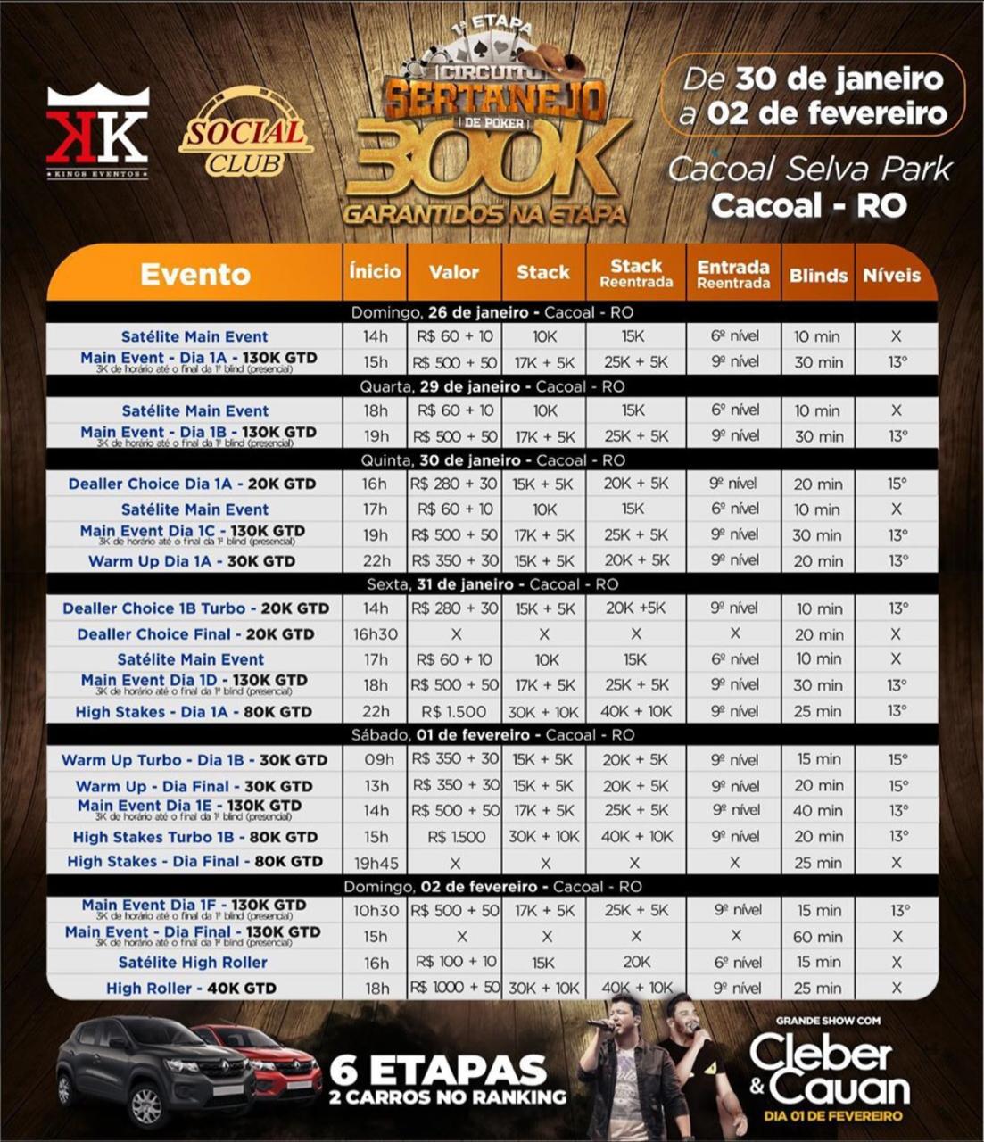 No cronograma do Circuito tem incluídos satélites e torneios como High Roller e Main Event, que, inclusive, tem R$ 130.000 de premiação garantida. Já no dia 1º de fevereiro, a dupla sertaneja Cleber & Cauan promete agitar a disputa com um show especial.