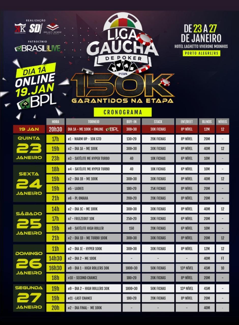 Ao todo, a Liga Gaúcha de Poker, realizada pela Kings Eventos, Showdown Eventos e Palace Poker, acontecerá em cinco etapas em diversas cidades do Rio Grande do Sul.