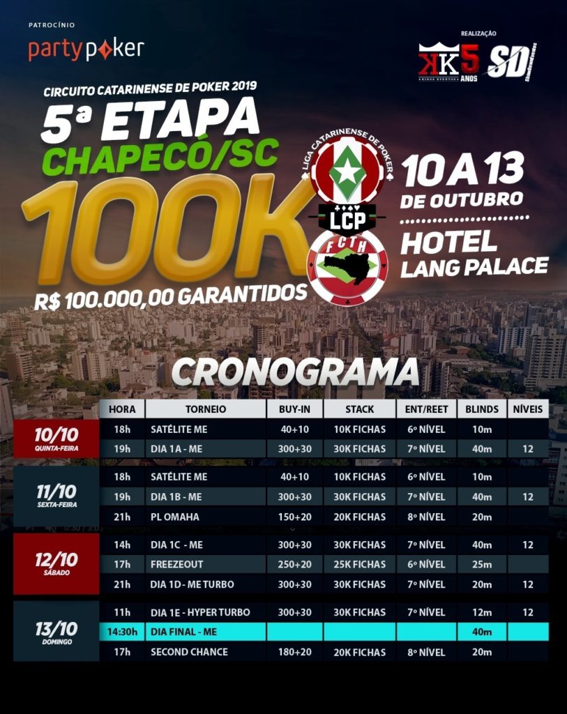 O início do Main Event do Circuito Catarinense de Poker é animador. Com apenas dois dias classificatórios realizados e somando os números de entradas no partypoker, Concórdia e Videira, o torneio já atingiu a marca de 144 entradas. O Dia 1B aconteceu ontem (12) e contou com a classificação de 15 jogadores.