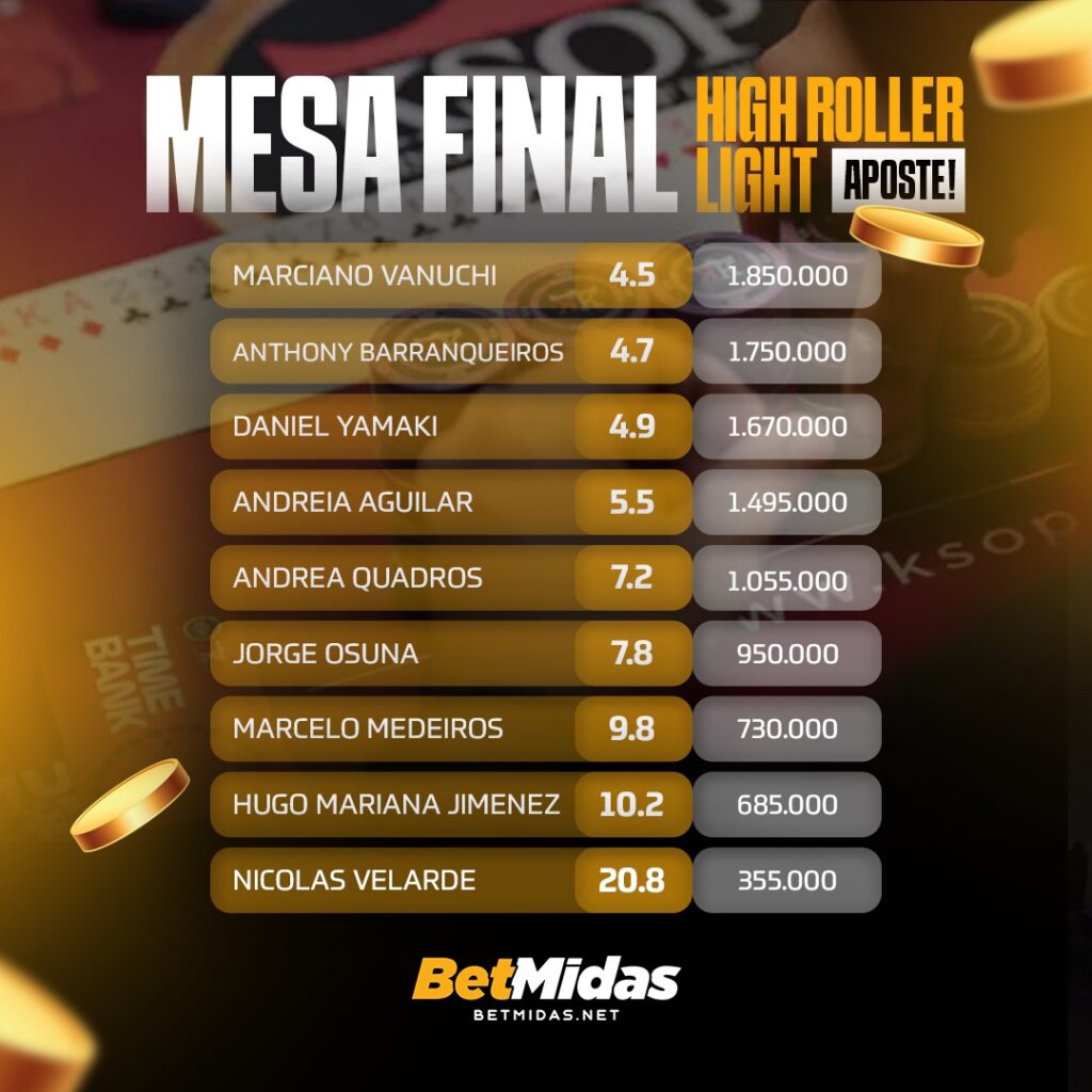 Confira como estão as odds para a mesa final do High Roller Light e faça sua aposta clicando aqui: