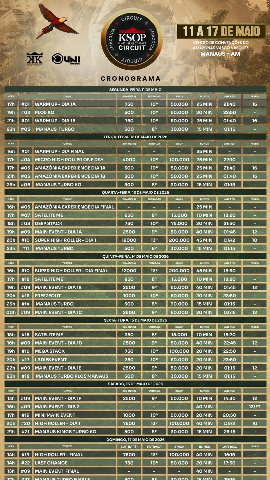 O KSOP retorna a Manaus entre os dias 11 e 17 de maio, com a etapa Circuit, que não valerá para o ranking. A próxima etapa que contará pontos será em Puerto Iguazú, de 3 a 9 de junho, no Cassino City Center, prometendo grandes emoções para os competidores.
