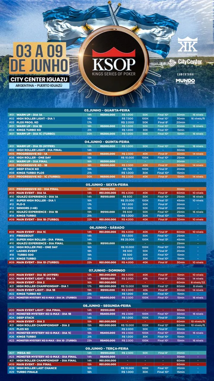 Com a tradicional estrutura deep, o torneio será disputado ao longo de três dias e contará com R$ 1.000.000 garantido, com buy-in de R$ 15.000, prometendo atrair os principais nomes do circuito. Eventos como Ladies, Kings Turbo, Mega KO, entre outros, também estão confirmados na programação. Fique ligado para não perder nenhum detalhe do KSOP Iguazú!