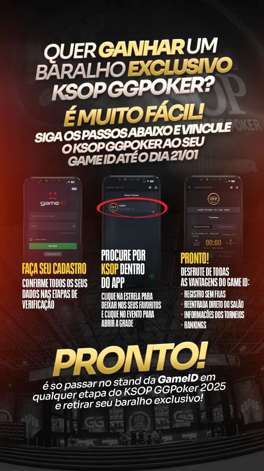 Os jogadores que fizerem isso poderão desfrutar de todos os benefícios que ele traz. Depois de feito tudo isso, basta passar nos stands do GameID e retirar os baralhos. Chega de fila! Aproveite agora mesmo o aplicativo e otimize o tempo jogando os torneios do KSOP GGPoker.