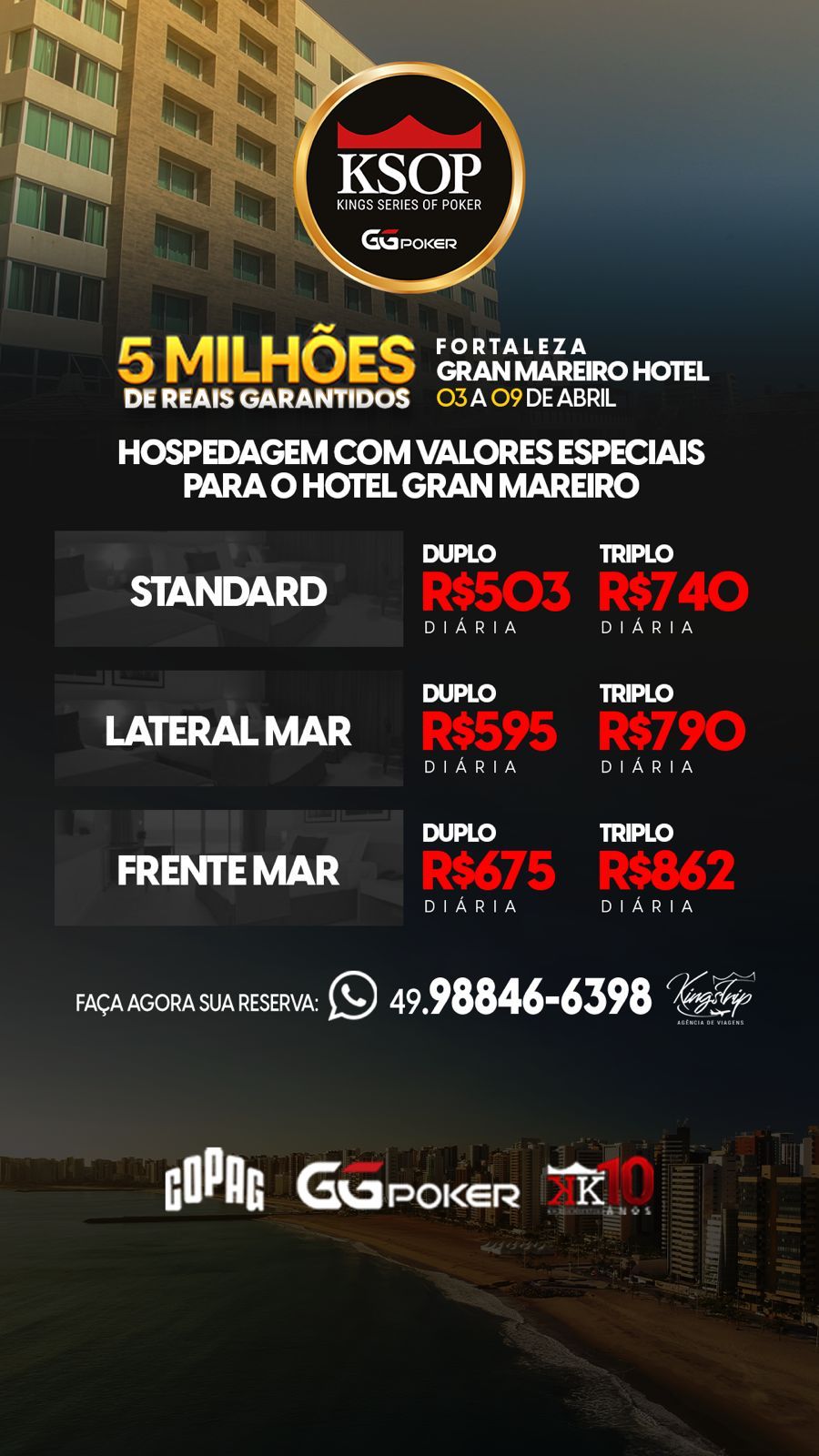 Para fazer a sua reserva, basta entrar em contato com o canal de atendimento no WhatsApp da Kings Trip pelo número (49) 98846-6398. O KSOP GGPoker Fortaleza vai acontecer entre os dias 03 a 09 de abril com R$ 5.000.000 garantidos.