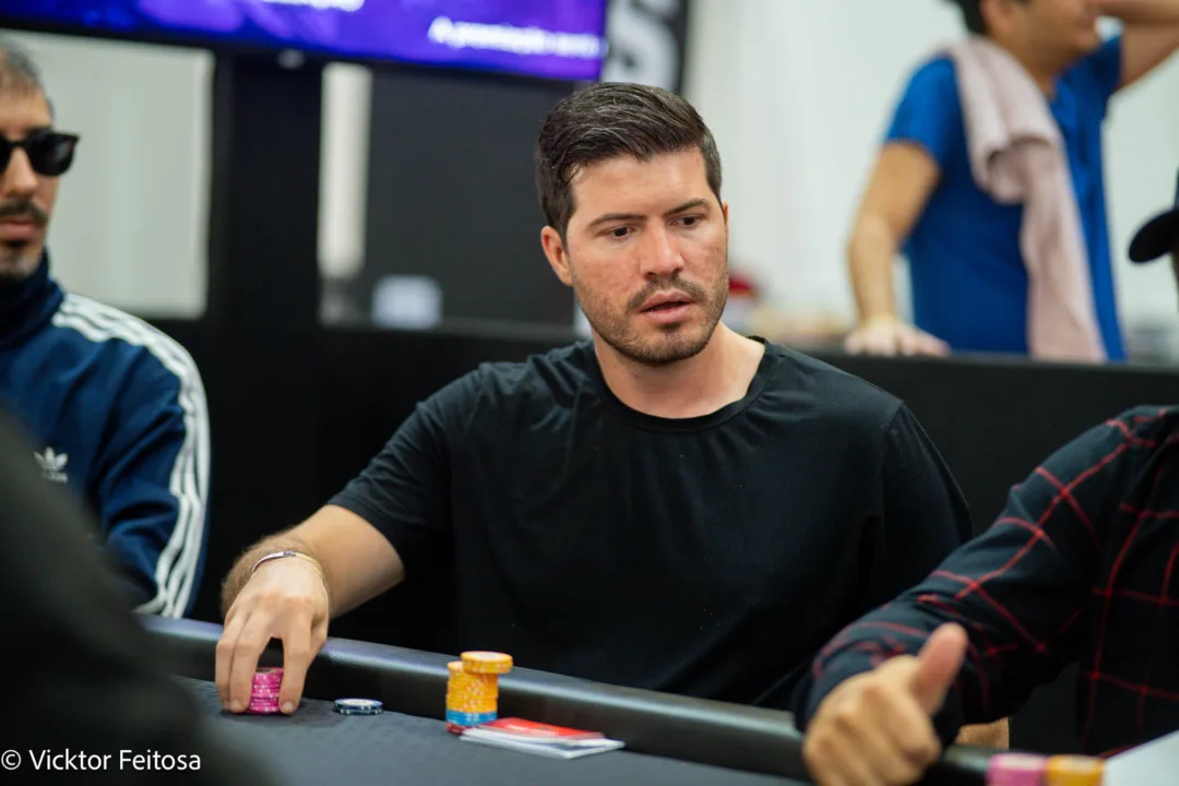 Chip leader disparado no momento, com quase 170 big blinds, ele viu Jessé Cesar dar all in de 191.000 fichas e pagou rapidamente, deixando o brasileiro desesperado. O pote de 100 big blinds era muito decisivo para o momento, e restava ainda o river. Jessé, iluminado, acertou o que precisava , trincou maior e se manteve forte no jogo.