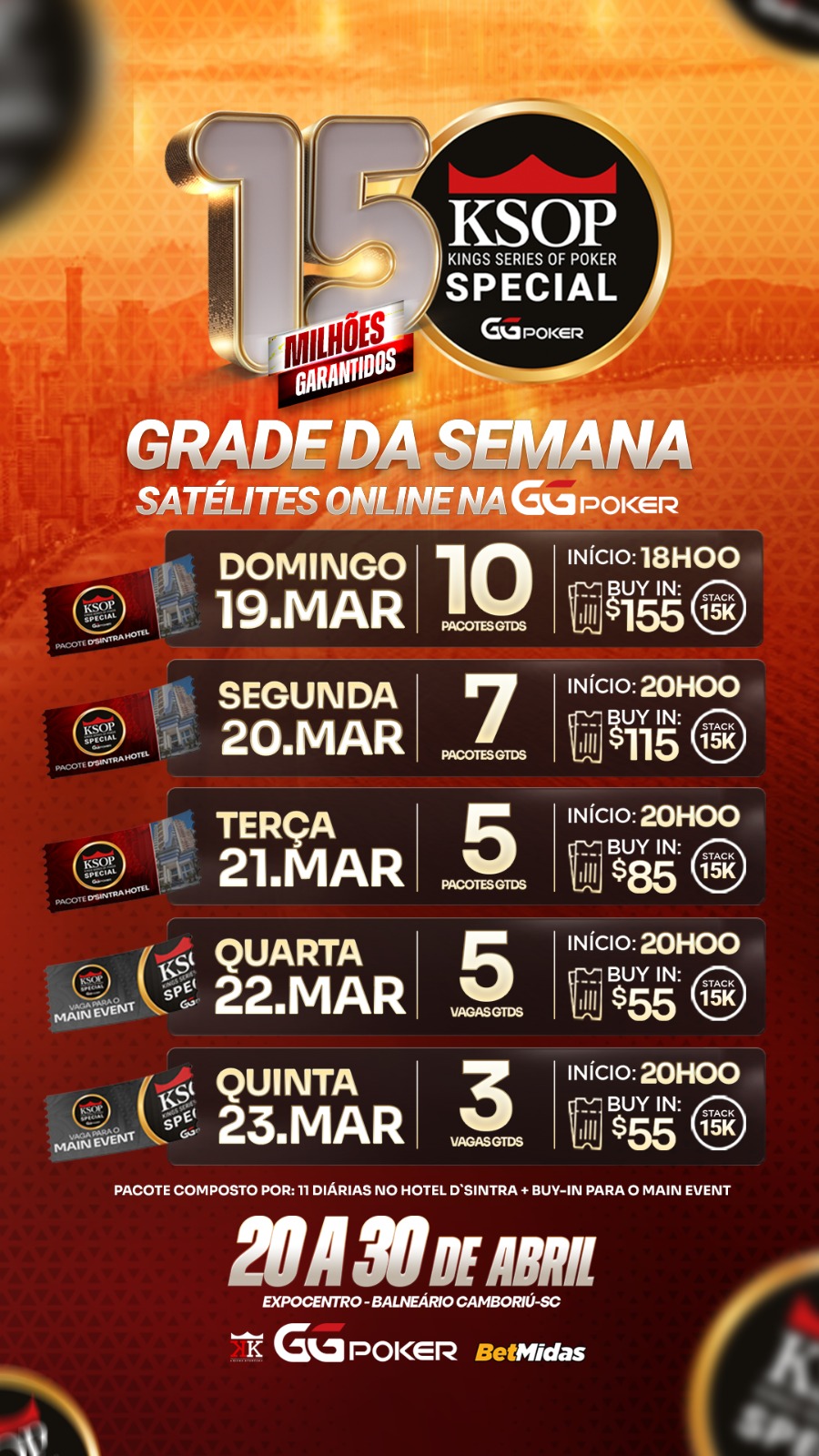Os jogadores interessados também poderão encarar os “STEPS” mais baratos até o torneio satélite. O KSOP GGPoker Special vai acontecer entre os dias 20 a 30 de abril no Expo Centro de Balneário Camboriú. O Main Event tem R$ 3.500 de buy-in e R$ 5.000.000 garantidos. A grade também terá o Super High Roller, Mystery Bounty e muitos torneios interessantes.