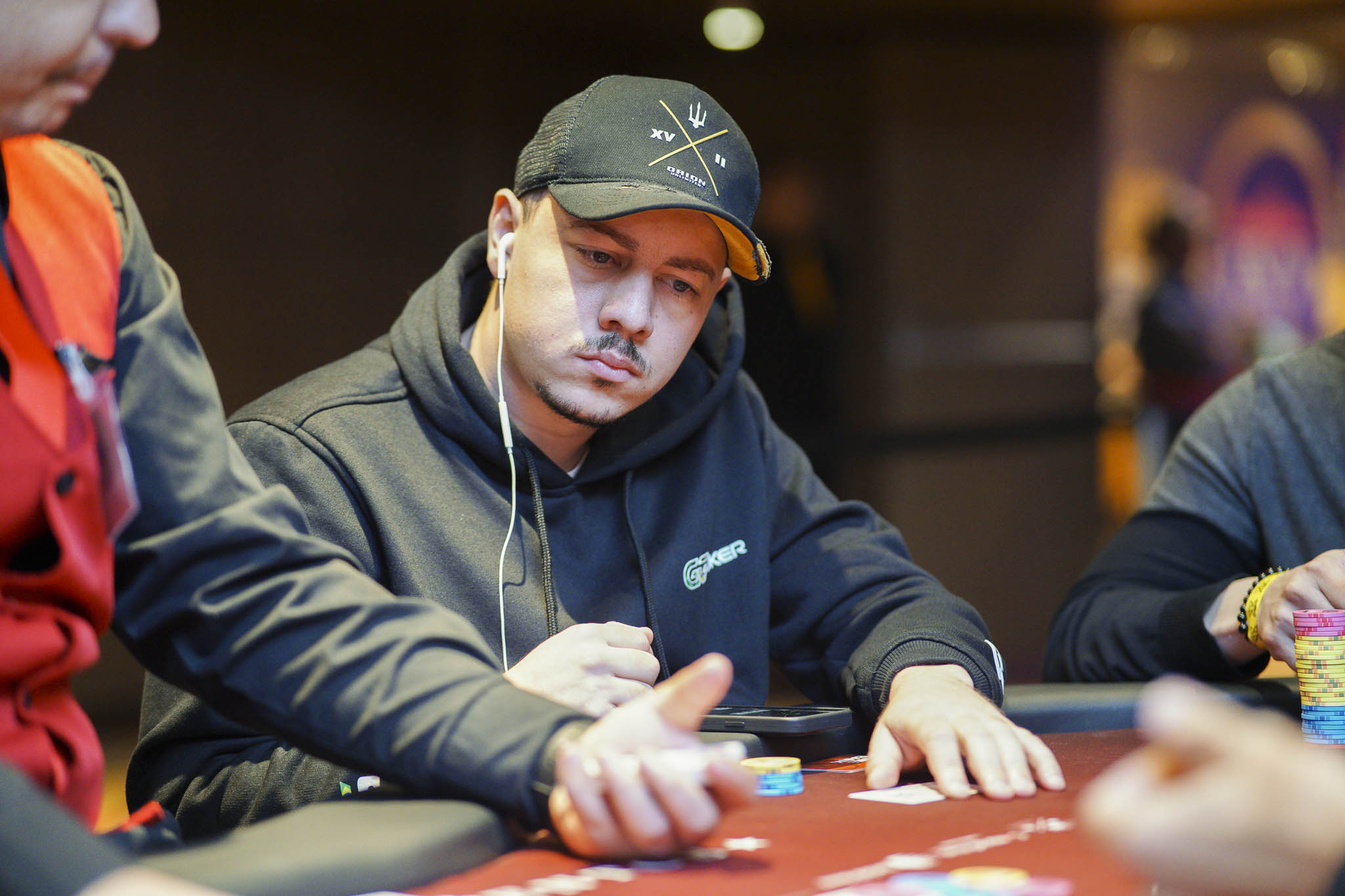 A jogada aconteceu nos blinds 25.000 / 50.000. Roberly Felício deu mini raise com seu e Thiago Tsukamoto, que havia assumido a liderança, deu um 3-bet com para 475.000 fichas. Do big blind, Saymon acordou com e foi para o 4-bet/shove com 870.000 fichas, colocando o torneio em risco.