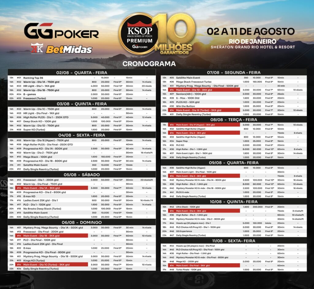 Confira abaixo um resumo com as principais competições da grade do KSOP GGPoker Premium: