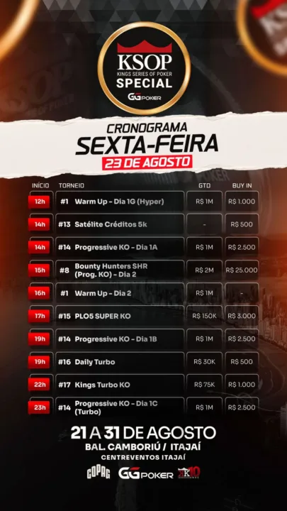 Ainda nesta sexta, outra grande atração fica por conta do Progressive KO. Com R$ 1.000.000 garantido pelo buy-in de R$ 2.500, o Progressive KO é uma das competições preferidas dos jogadores e promete movimentar o salão do Centreventos Itajaí. São três classificatórios hoje: o Dia 1A, às 14h, o Dia 1B, às 19h e o Dia 1C (Turbo) às 23h.