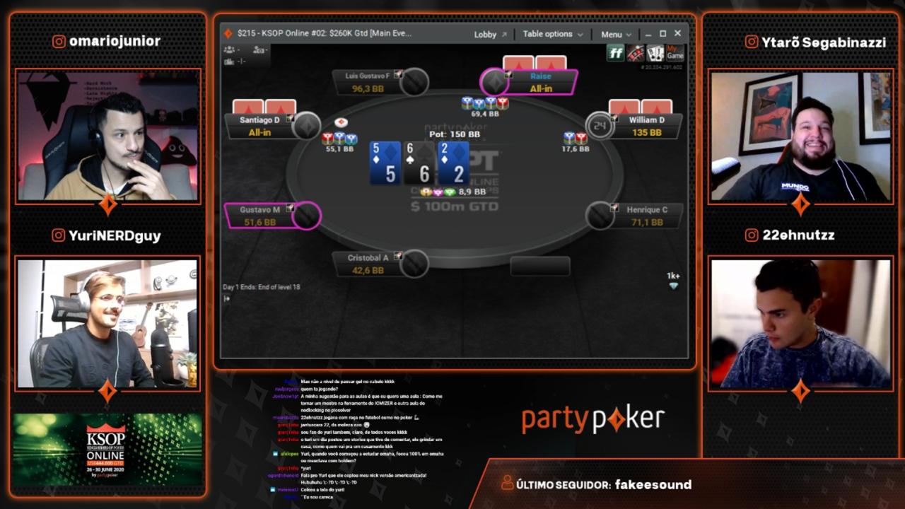 A dupla do 9Tales, dois nomes da elite do poker brasileiro, participaram de torneios do KSOP Online e brincaram bastante durante a transmissão com várias falinhas. Inclusive, eles até caíram na mesma mesa do Main Event por coincidência. Ainda no começo do Dia 1A, Yuri levou uma bad beat gigantesca com 22.