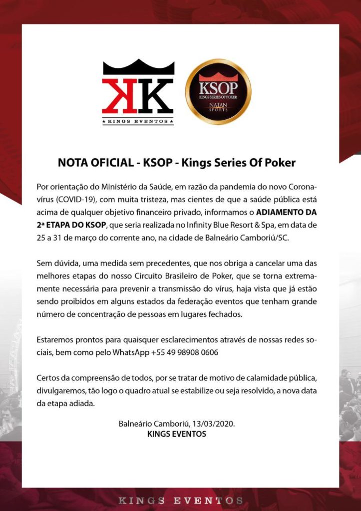 Assim como já havia ocorrido em diversos lugares do mundo, a pandemia do Coronavírus chegou com força no Brasil. E isso afetou o poker nacional. Em um comunicado oficial, a Kings Eventos decretou o adiamento da segunda etapa do KSOP em 2020, que seria na cidade de Balneário Camboriú entre os dias 25 a 31 de março.